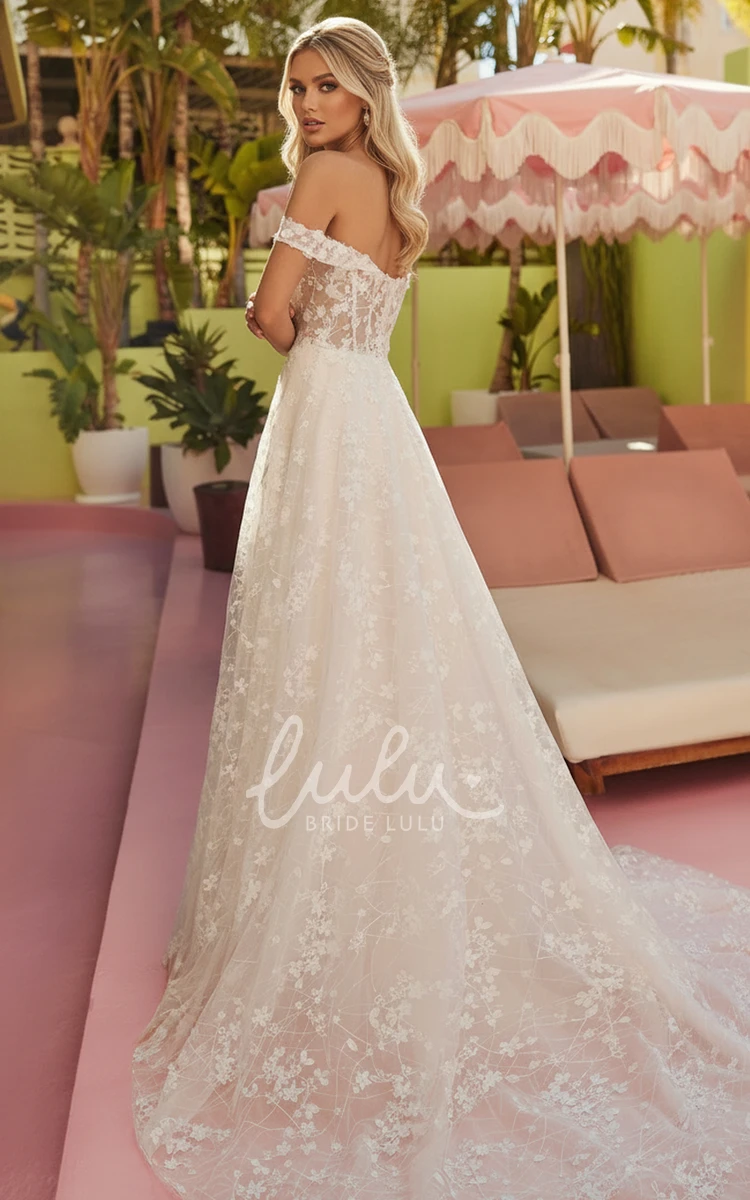 Boho Lace Wedding Dress A Line Off Shoulder Illusion Corset Floral Lace Bridal Gown
