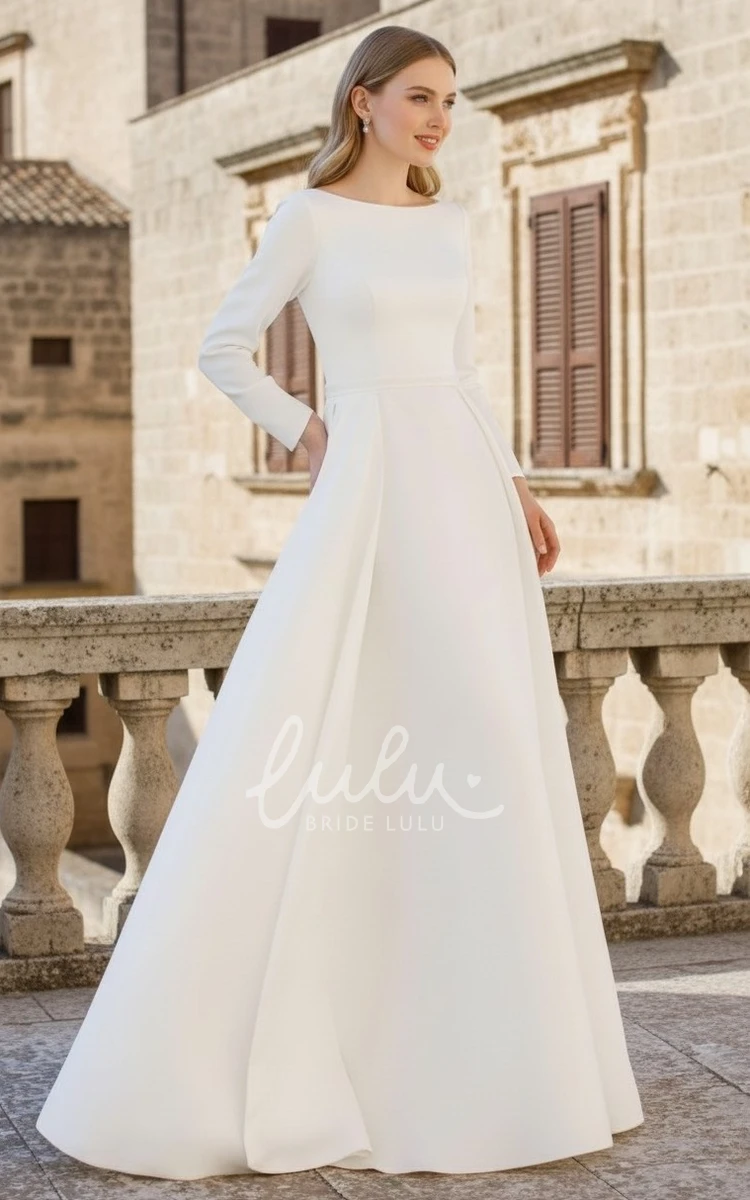 Elegant Minimalist Long Sleeve Satin Wedding Dress with Boat Neck Classic A-Line Bridal Gown for Modern Brides