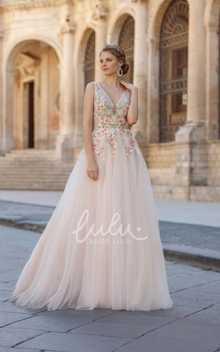 Elegant Sexy A-Line V-Neck Lace Tulle Spring Wedding Dress with Deep V Back and Flowers