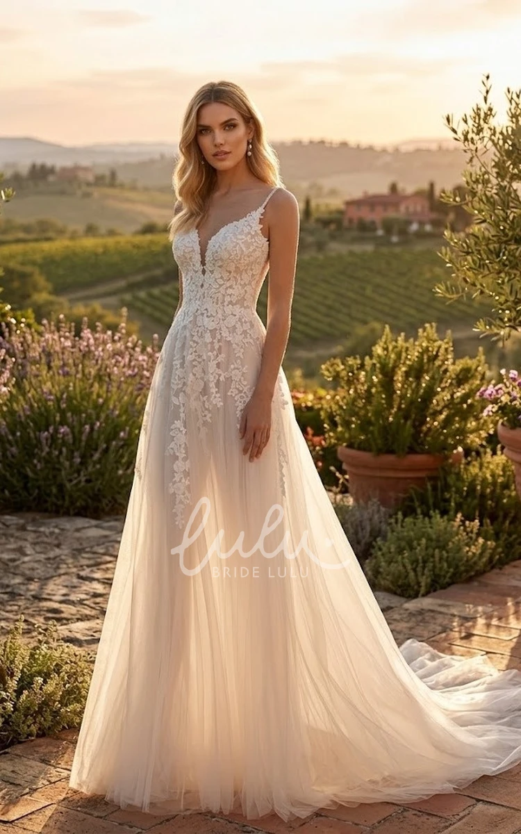 Lace A-Line Country Sleeveless Wedding Dress Spaghetti Tulle Garden Open Back Bridal Gown
