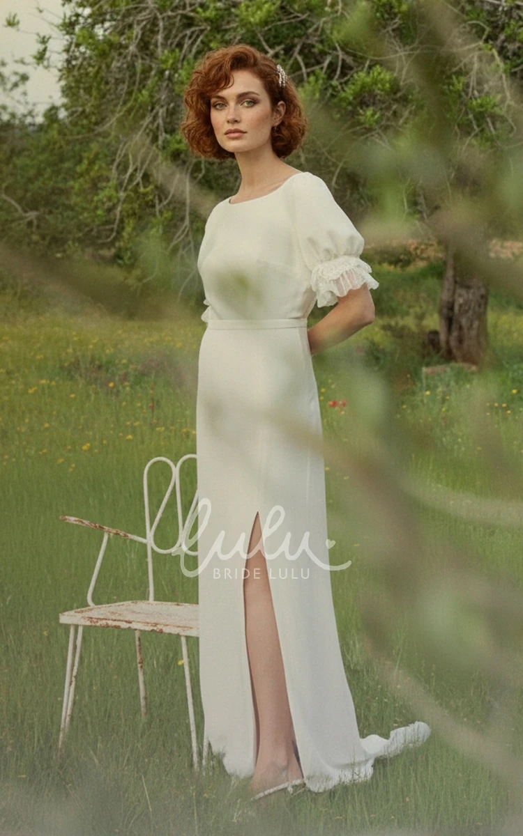 Minimalist Puff Sleeve Modern Wedding Dress Simple Satin Open Back Bridal Gown with Slit